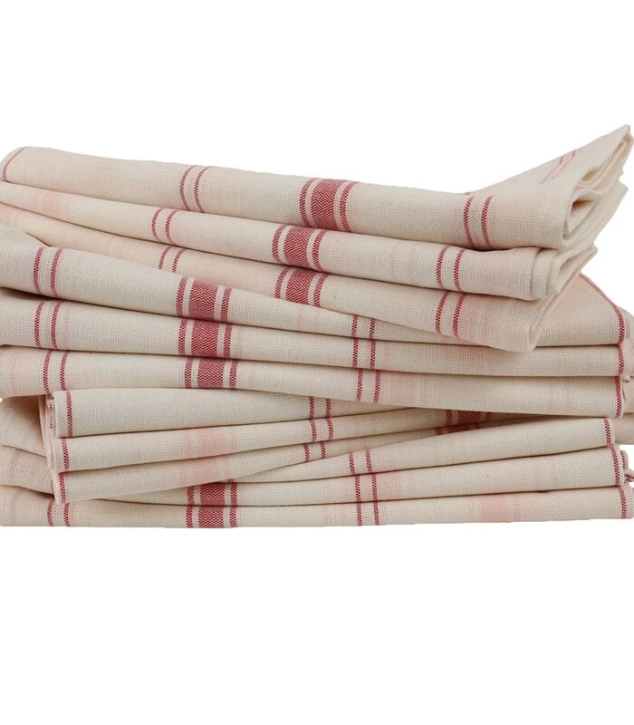 Het bezit van mooie theedoeken van natuurlijke vezels is zowel een nuttig als een praktisch gebaar, aangezien de kwaliteit superieur is aan die van synthetische theedoeken. Het is ook een accessoire dat een rustieke en authentieke toets geeft aan uw keuken. Wij hebben ervoor gekozen de Brasserie theedoeken te vervaardigen met een meerderheid van linnen draden, die absorberender zijn dan katoenen draden. Zodra de eerste wasbeurt gedaan is, zul je ontdekken hoe zacht en mollig ze zijn. En op ecologisch vlak heeft linnen in de landbouw geen irrigatie nodig, in tegenstelling tot de 10.000 liter water die nodig is om 1 kg katoen te produceren. Kenmerken van de linnen en katoenen doeken BRASSERIE Verkrijgbaar per batch van 2, 3, 6, 12 in de kleuren blauw, oranje, rood, geel Zachte touch vanaf de levering, dankzij de keuze van fijne vezels. Samenstelling : 52% linnen – 48% katoen Onderkant van de theedoeken in beige Afmeting : 55x81cm De halfbloed theedoeken worden gebruikt voor intensief gebruik, zowel in glaswerk als voor pannen. Restaurant professionals bestellen dit product bij ons. De dichte weving van 200gr/m2 verlengt de levensduur van de doek, was na was. Hier is een set van 12 katoenen linnen theedoeken verkrijgbaar in blauw, oranje, rood en geel. Onderhoud van de ongebleekt katoenen linnen theedoeken Om ze zachter te maken, is het raadzaam ze vóór de eerste warme wasbeurt in koud water te laten weken. Daarna kunnen ze op 60°C worden gewassen en in de machine worden gedroogd. Gemaakt in de EU Oeko Tex standaard