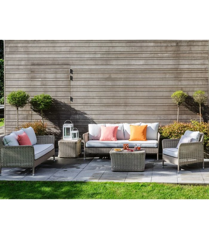 Dit is een hele mooie bank voor twee personen. Een voor twee personen en een voor drie personen. Een prachtig weefwerk van drie kleuren hars in de geest van het ouderwetse open riet. Van KOK Maison, rotan specialist sinds 1920.