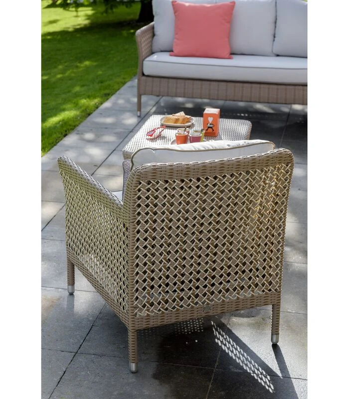 Eenvoudige en compacte lijnen voor deze fauteuil in Antibes KOK MAISON Kunstvezel, met een mooi vlechtwerk. Wij vervlechten drie kleuren resin om de wit/beige tinten van de riffen bij eb na te bootsen, dit alles in een vlechtwerk in de geest van het oude open weven. Deze collectie is overal te vinden en blijft zeer verfijnd, hij vindt natuurlijk zijn plaats aan zee, op oude teakhouten dekken, in chalets, in de bergen, of op de fiets. Dimensies: Hoogte 80 X breedte 66 X diepte 75 – zitting 41.Het kussen is gevuld met polyetherschuim 30kg/m3 voor de zitting en polyester watten voor de rugleuning. De stoel is geschikt voor gebruik buitenshuis: polyethyleenkunstvezel met hoge dichtheid; gegarandeerd tegen UV, slecht weer, grote temperatuurschommelingen (–15°C, +55°C), zout aan zee. Rattan specialist sinds 1920, KOK MAISON biedt kwaliteitsmeubelen, comfortabel en bestendig, niet alleen door de keuze van de materialen maar ook door de zorgvuldige zorg die aan elk detail van hun onderdelen wordt besteed. Constructie: Geluiddempend en hittebestendig: Structuur in gelakt aluminium. Weven in hoge dichtheid polyethyleen Kunstvezel. Kussen: 30kg/m3 polyethyleenschuim voor de zitting en polyester watten voor de rug. Stof 100% olefine