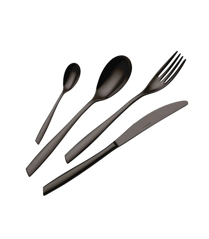Deze prachtige zwarte 16–delige EME Eleven bestekset bestaat uit 4 tafelvorken, 4 tafelmessen, 4 tafellepels en 4 koffielepels. Ieder item is gemaakt 18/10 roestvrij staal.