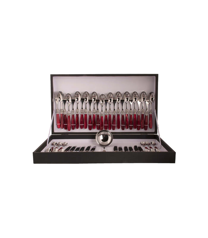 Deze EME Mona Lisa bestekset is ontwikkeld voor de liefhebber van bestek van Italiaanse hoogwaardige kwaliteit en een eigentijdse afwerking. Traditioneel en modern is in deze bestekset samen gebracht, waarbij het bestek licht in gewicht is. Deze serie kenmerkt zich door een uitstekende balans in dikte van het handvat en het lange, elegante lemmet. Deze prachtige 49–delige bestekset bestaat uit 12 tafelvorken, 12 tafelmessen, 12 tafellepels, 12 koffielepels en 1 soep/opscheplepel. Ieder item is gemaakt 18/10 roestvrij staal en heeft een acryl bordeaux rood handvat.