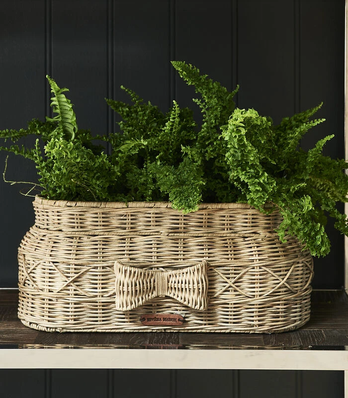 Ronde plantenbak, handgemaakt van rustic rattan, voor een flinke plant. Op de grond, of op een sidetable of dressoir komen bak én plant dan volledig tot hun recht. De bak heeft een leertje met RM–branding. Hij is aan de binnenkant stevig bekleed met plastic, tegen lekken bij het water geven.