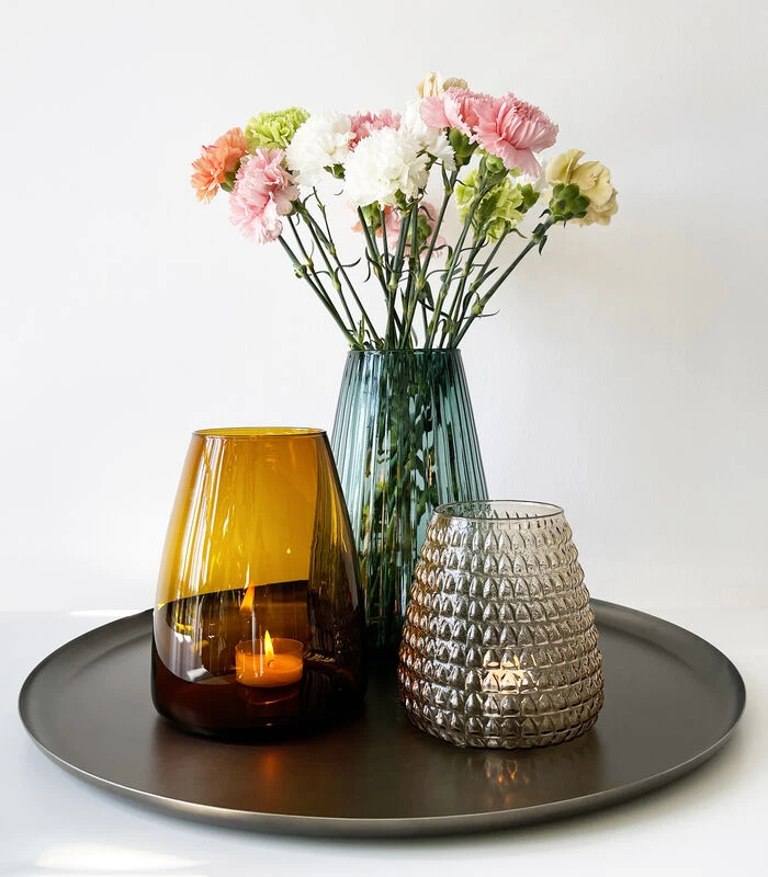 Een vaas komt altijd van pas, niet waar? De Dim vazen zijn gemaakt uit mondgeblazen glas, vaatwasser safe. Zijn neutrale kleuren zorgen ervoor dat alle bloemen mooi zullen uitkomen. Hij is verkrijgbaar in drie verschillende soorten glasstructuur. Zo kun je zelf kiezen of je voor basic wilt gaan of voor de net wat meer uitgesproken variant. Bloemen of kaarsen, deze vazen zullen uw interieur altijd oplichten.