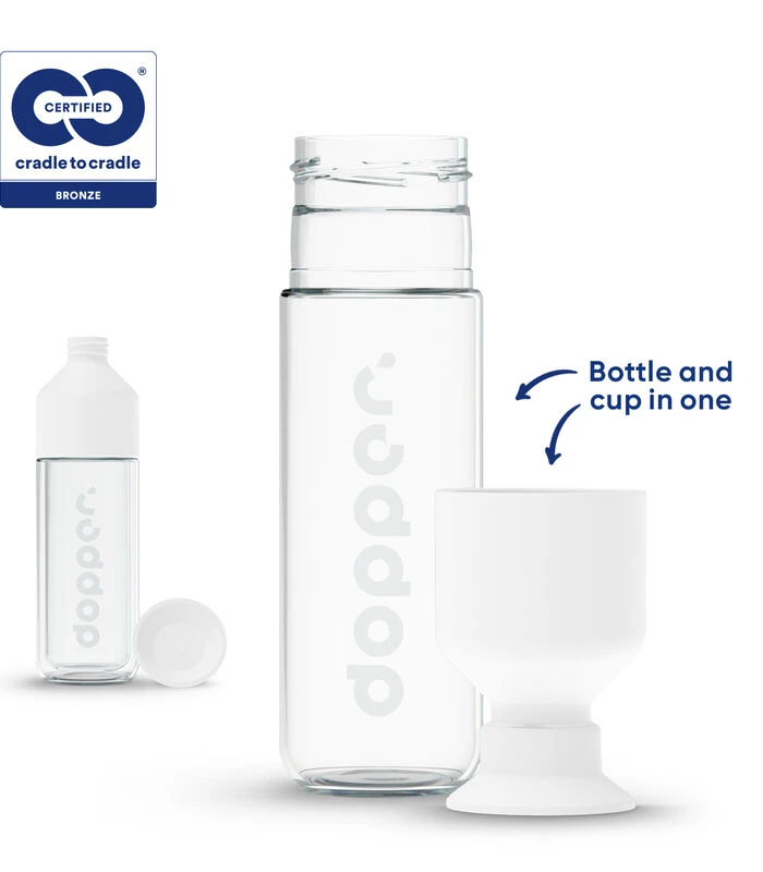 Het driedelig ontwerp – fles, beker en dop – is gemakkelijk te vullen en schoon te maken, door jou of je vaatwasser (max. 65 graden). En natuurlijk is de Dopper Glass vrij van BPA en ftalaat.