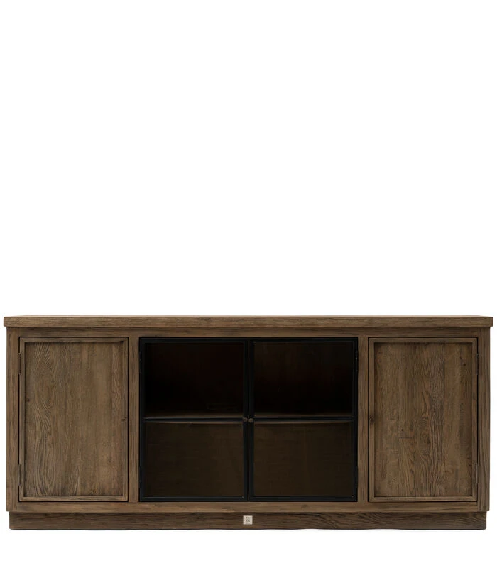 Met open en gesloten delen is dit dressoir Clearwater. De kast is gemaakt van hergebruikt eiken– en essenhout, wat zorgt voor een karaktervolle uitstraling. De kast heeft vier deuren, twee gesloten en twee van glas met een lijst van donker metaal. Achter de gesloten deuren bevinden zich twee blinde laden.