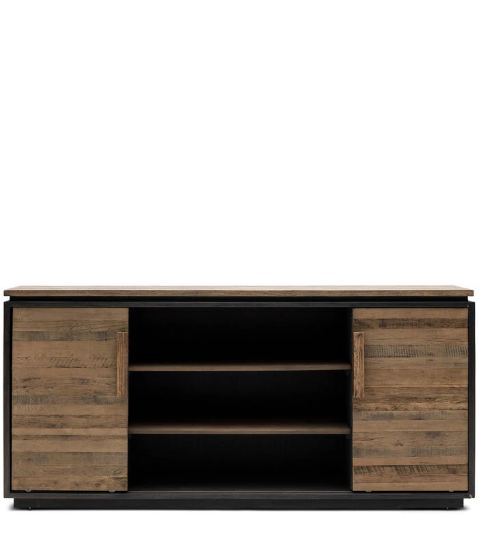 Speel met ruimte en opstelling met dit dressoir uit de Saratoga Hills–collectie. Deze kast is gemaakt van gerecycled eikenhout, in twee verschillende kleuren, namelijk naturel en donker gebeitst. Zo zijn het blad, de planken en de twee schuifdeuren licht van kleur. Door de schuifdeuren te verplaatsen, kies je zelf welke planken in het zicht komen.