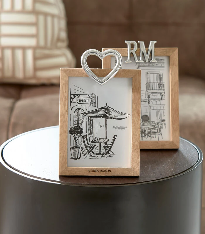 Het RM Hanging Heart Photo Frame 13×18 is een fotolijst voor een staande foto van 13 x 18 centimeter. De lijst is gemaakt van een mangohouten frame waarin een gravure van ‘Rivièra Maison’ is gezet. Op de bovenste rand is een hart van zilverkleurig aluminium geplaatst.