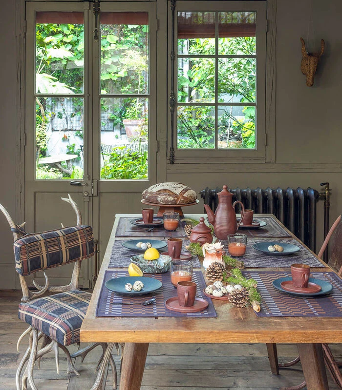 Een ritmische placemat met natuurlijke motieven die een rustieke en landelijke sfeer op uw tafel brengen.
