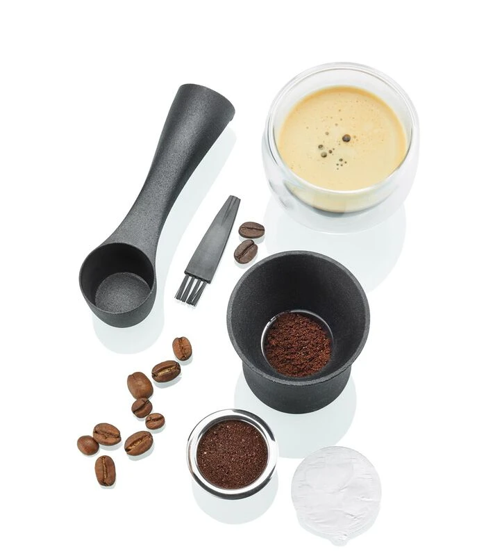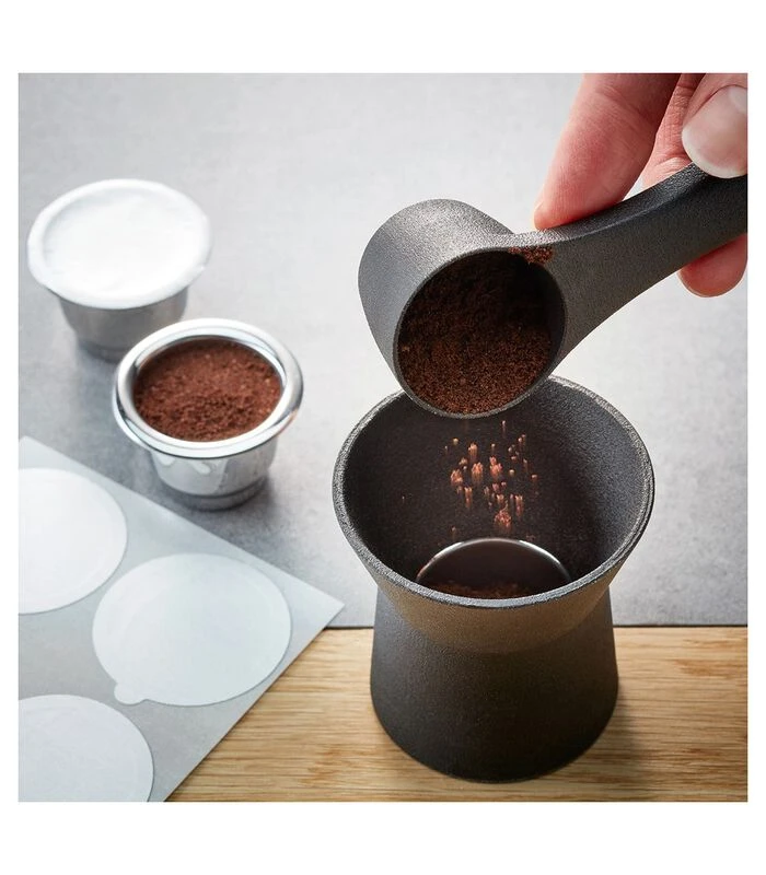 Duurzaam en geldbesparend tegelijk – zo gaat het in zijn werk: trechter op lege capsule zetten, espressopoeder met een maatlepeltje ingieten en met tamper verdichten, capsule met zelfklevende aromasticker afsluiten – klaar. Na gebruik gewoon folie verwijderen, de capsule schoonmaken en meteen is deze weer bruikbaar.