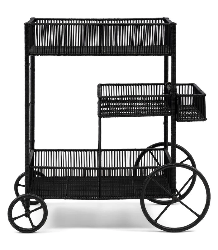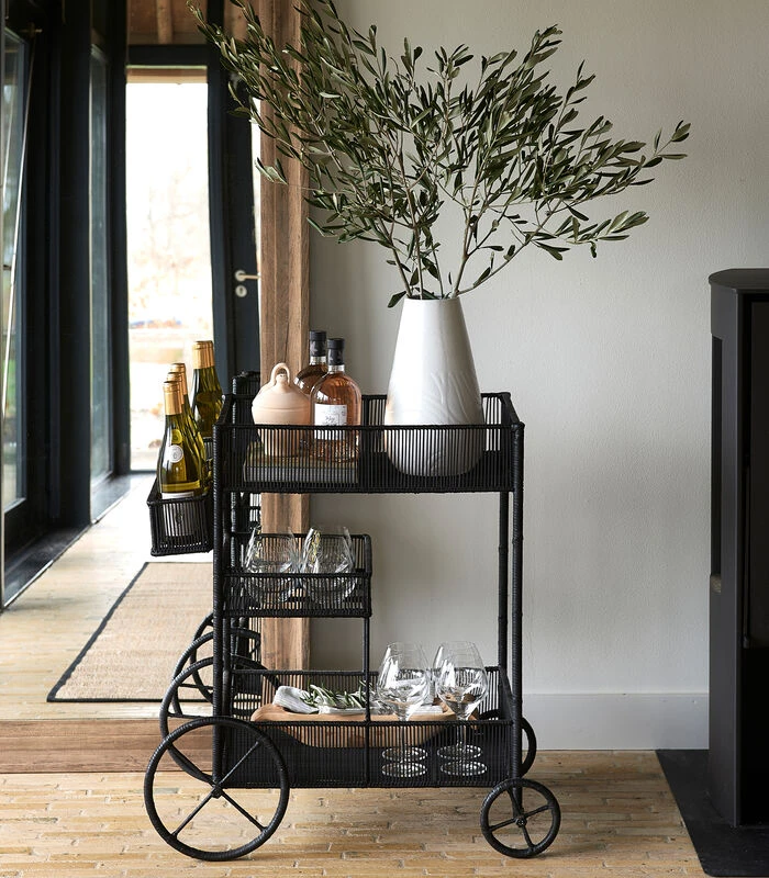 Heerlijke trolley van zwart gemaakt rattan, kunstig verwerkt tot een kleine huisbar. Genoeg plaats voor je favoriete drankjes en je mooiste glazen. De trolley is met de hand gemaakt, natuurlijk, net als de andere Punta Cana kleine meubels.