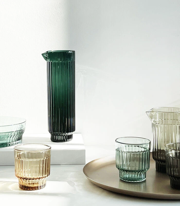 De stapelbare Lima glazen met bijpassende karaffen en kommen zijn vakkundig met de mond geblazen. Elk stuk is lichtjes verschillend van het andere, omdat elk stuk met de hand gemaakt is. Het blazen van het glas in een mal vormt het fijne ribbelpatroon en creëert een moderne maar elegante uitstraling. Schenk uw favoriete drankje in en zie hoe het licht en de textuur verschijnen in de rimpelingen van het glas. Kies uit 5 verschillende kleuren in afwerking. Combineer de tumblers met de karaffen en kommen om een perfecte tafelsetting te creëren. Met Lima is een geweldige avond onvermijdelijk.