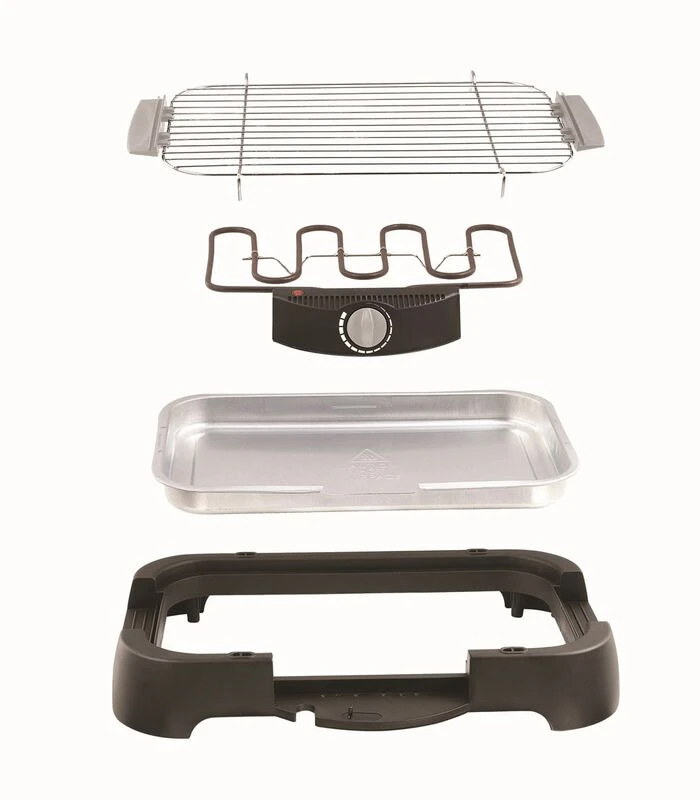 Tafel barbecue grill Kookoppervlak 40 x 23,5 cm Afneembare thermostaat en verwarmingselement Stroom indicatielampje Afneembare en in hoogte verstelbare chromen grillplaatVerwijderbare aluminium vet opvangbak 4 antislipvoetjes