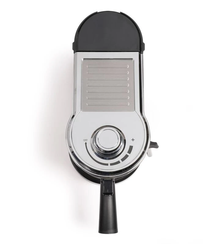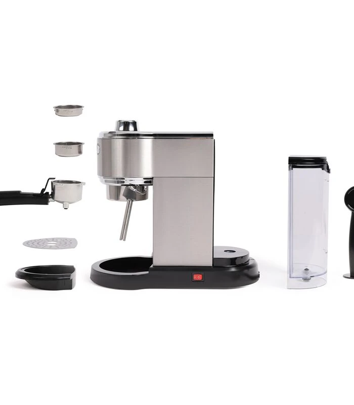 – 15 bars – Uitneembaar reservoir 1 L – Percolator voor gemalen koffie en papieren ESE–pads – 3 schakelaars: 1 kop ? 2 koppen ? aan/uit stoompijpje – 3 roestvrijstalen filters: 1 kop, 2 koppen en voor ESE–pads – Kopjesopwarmplaat – Roestvrijstalen stoompijpje – Uitneembare geperforeerde plaat – Maatlepel met aanstamper inbegrepen