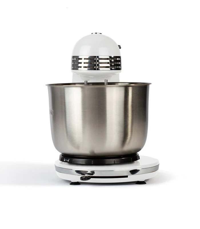 Multifunctionele mixer om uw zoete en hartige gerechten te bereiden. Roestvrijstalen kom met een inhoud van 3 l. 6 snelheden variaties. 2 hulpmiddelen: metalen garde, deeghaak, voor het kneden, klopen en mixen van uw pasta, taarten, pannenkoeken, pizza, eiwit, pasta, slagroom, brood, taartjes , desserts. Schuifknop om de kom op de basis te schuiven voor een eenvormige mengsel en eenvoudig te verwijderen. Uitwerpknop. Antislipvoetjes.