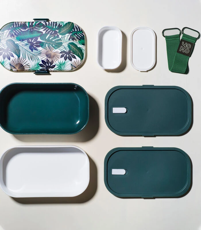 Het bestaat uit 2 onafhankelijke bakjes met uitneembare tussenschotjes, een klein sauspotje van 95 ml, een elastiek dat, bevestigd dankzij twee haakjes, het geheel optimaal in stand houdt.