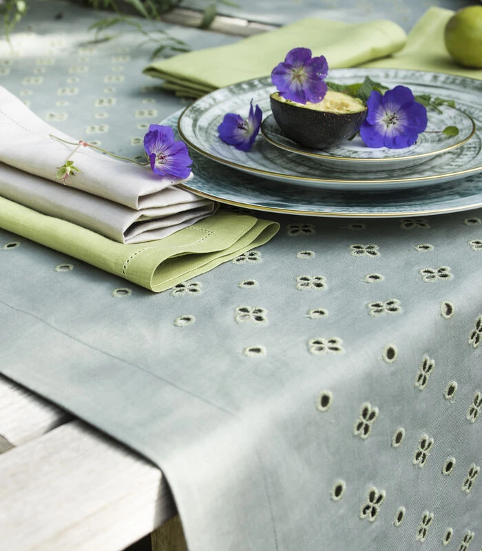 Luxembourg, tafellinnen met in het midden prachtig geborduurd ajourwerk. De stippeltjes en kleine bloemetjes met hun mooie ronde vormen zijn geïnspireerd op vintage metalen tuinmeubelen.