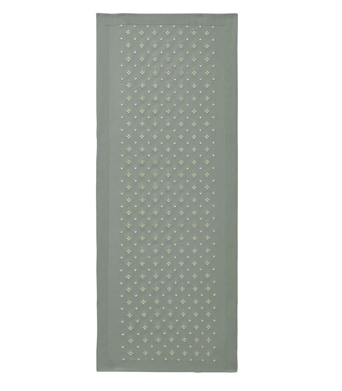 100% linnen geweven en geborduurd in Frankrijk. Tafelloper met recht afgewerkte hoeken en vlekwerende Teflon–finish.