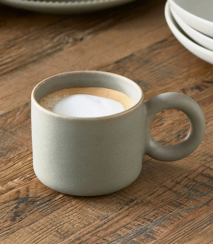 Dit zijn de groene mokken uit ons Marseille–servies. Je herkent de grijsgroene kopje, die overigens ook verkrijgbaar is in een crèmekleurige variant, direct aan het grote oor. Deze ergonomische handgreep is ongeveer even groot als de mok zelf. Dankzij het ronde oor ligt de drinkmok goed in de hand. Al het servies uit deze serie is handgemaakt van keramiek.