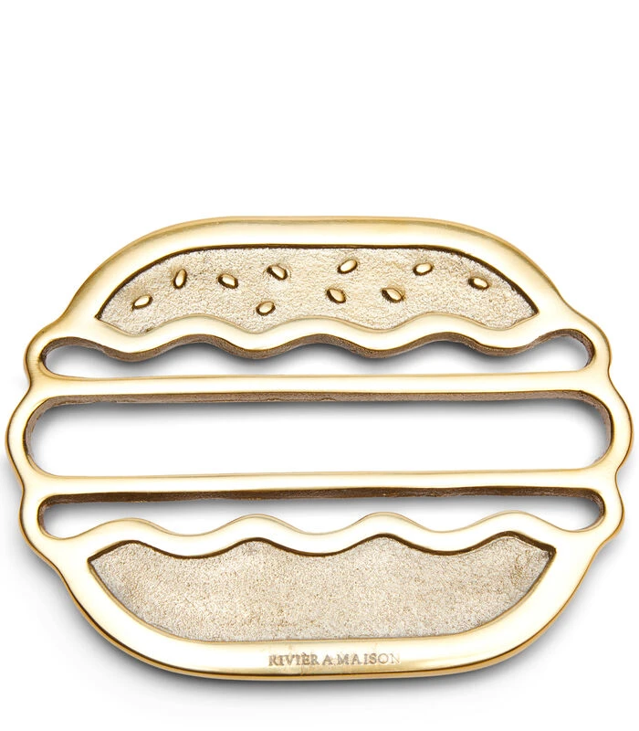 Waan je in een burgerrestaurant met deze Classic Burger–pannenonderzetter. De onderzetter is uitgevoerd in een glanzende gouden kleur en heeft de vorm van een burger. De rubberen pootjes aan de onderkant van de onderzetter zorgen ervoor dat de warmte de ondergrond niet bereikt en laten bovendien geen krassen achter op het tafelblad.