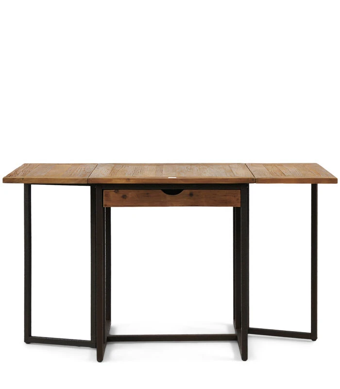 De verschillende tafels uit de Shelter Island–collectie kunnen naar wens groter en kleiner worden gemaakt door het tafelblad naar de zijkant te laten hangen of het blad te ondersteunen met de open te klappen ijzeren tafelpoot. Het tafelblad is met de hand gemaakt van oude deuren van gerecycled iepenhout en hierdoor heeft iedere tafel een eigen unieke uitstraling.