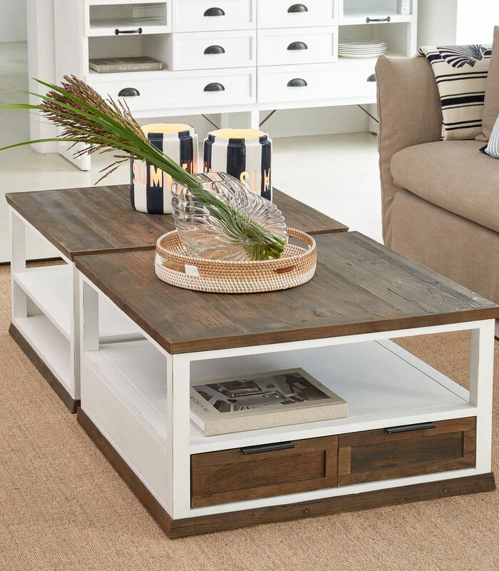 De Metropolitan Coffee Table 80X80 is een salontafel met veel opbergruimte. Het blad is gemaakt van old elm: hout van oude deuren uit China. Aan de ene zijde bevinden zich twee lades. De andere zijde is open; daar leg je bijvoorbeeld mooie tijdschriften neer. De tafels zijn handgemaakt: geen twee coffee tables zijn hetzelfde! Ook verkrijgbaar in andere varianten en formaten.