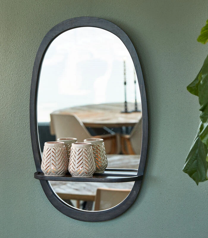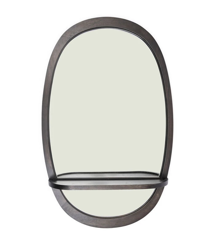 De RM Miramar Wood Mirror is een houten spiegel met een organische vorm. Onderaan is een klein, rond plateau aanwezig. De ovale wandspiegel is gemaakt van mangohout en bewerkt met een donkere coating.