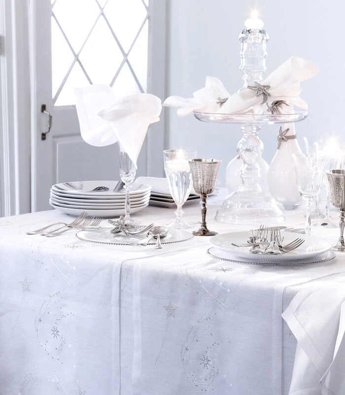 Model Stella is een effen linnen tafellaken, waarop kometenmotieven zijn geborduurd. Het is eveneens versierd met Swarovski®–kristallen.
