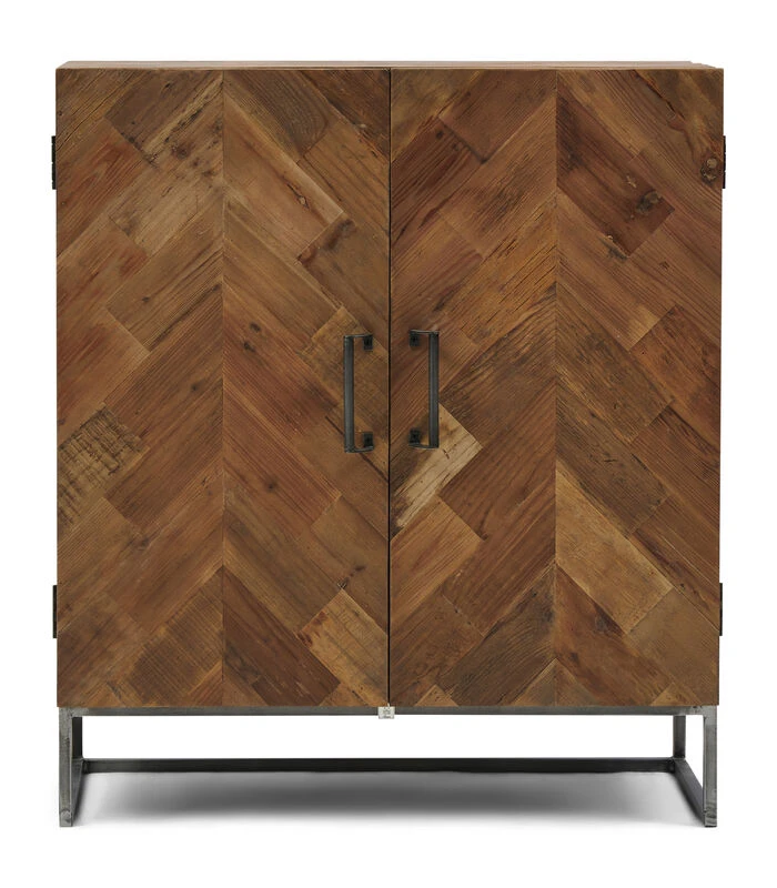 In dit kastje zien we zowel oud dennen–, grenen– als iepenhout terug. Met de grootste zorg werd ieder plankje aan de voorkant van de kast op een basis gelijmd, waardoor er een visgraatpatroon ontstaat. Het kastje is 91 centimeter hoog, waardoor hij uitnodigt om er iets bovenop te zetten ter decoratie.