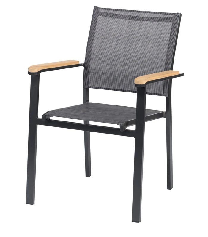 Heerlijk genieten in de Memphis tuinstoel van Exotan. Deze stoel is stapelbaar en heeft een frame van aluminium en is voorzien van een hoogwaardig textilene zitting. Dit is comfortabel, sneldrogend en Uv–bestendig. De armleuning is afgewerkt met teak FSC®. Door de combinatie van mooie materialen is deze tuinstoel onderhoudsarm.