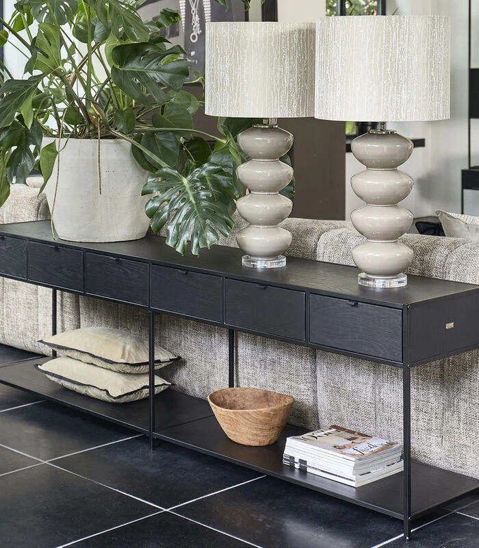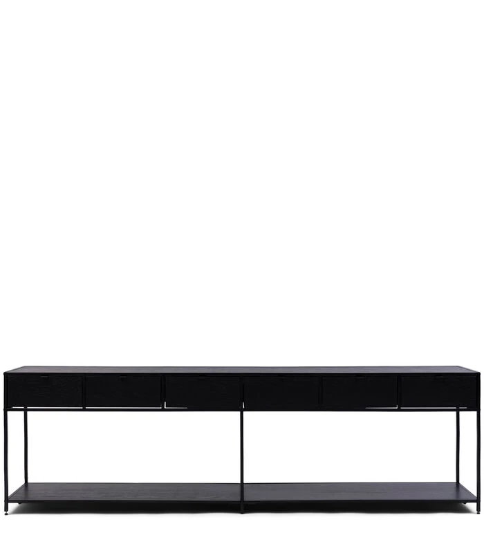 Tv–meubel The Bobby is een multifunctionele, lage kast. Dit dressoir is ontworpen om laag genoeg te zijn om er een tv boven te hangen, maar ook een mooi kunstwerk misstaat natuurlijk niet. Of plaats hem achter de bank als sidetable, de keus is aan jou. Daarnaast springt het donkere fineer van essenhout in het oog, evenals de zes handige lades.