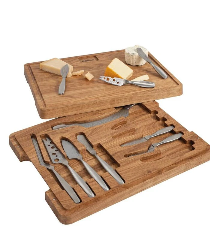 De BOSKA Ultimate Cheese Set Monaco+ is het ultieme cadeau voor de echte kaasliefhebber. Deze kwalitatieve set bevat een chique, Europees eikenhouten serveerplank en 10 sterke, roestvrijstalen kaasmessen. De messen hebben de juiste eigenschappen voor het