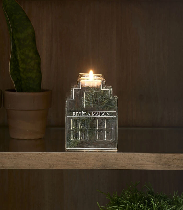 Dit grachtenpand van glas heeft op zijn dak een vorm voor een waxinelichtje. Maar dat vormpje kan ook worden losgemaakt, zodat je in het grachtenpand decoraties en kleine versiersels kunt doen, om het geheel een feestelijk aanzien te geven. De RM–branding mag hier natuurlijk niet ontbreken.