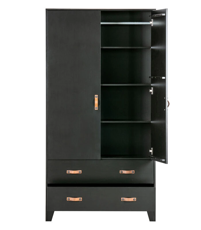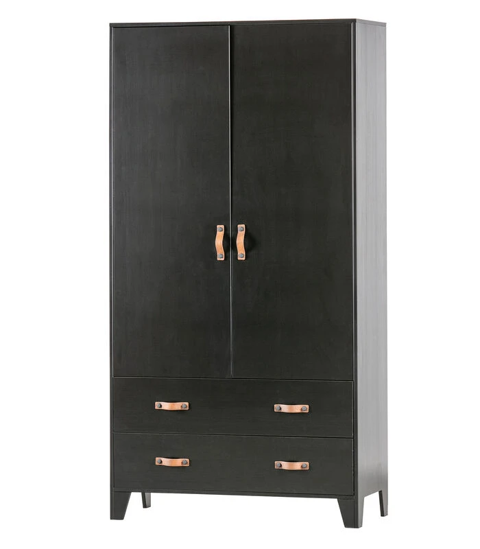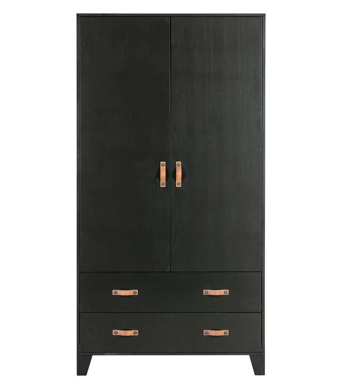 Deze Dian garderobekast is eigentijds, basic en een tikkeltje stoer. Dian is een eigen ontwerp en komt uit de collectie van het merk WOOOD. De garderobekast is gemaakt van grenen dat is afgewerkt in een stoere zwarte kleur. De kast is voorzien van twee lades met twee leren grepen per lade en twee deuren met een leren greep. Dit zorgt voor genoeg opbergruimte. Door de moderne, stoere uitstraling past deze kast in vele slaapkamers thuis!