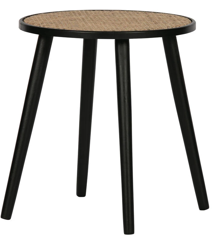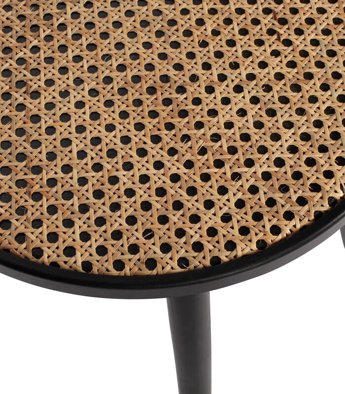 MDF tafelblad met naturel rotan binnenzijde en zwart grenenhouten poten.