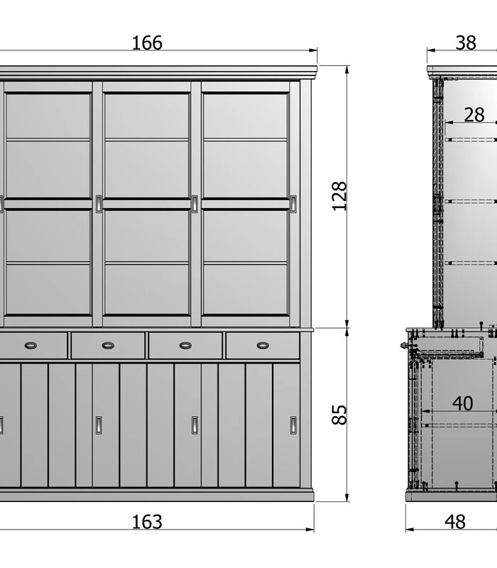 Deze landelijke winkelkast kast bestaat uit twee losse delen. De onderkast heeft de afmetingen 85x163x48cm (hxbxd) en de bovenkast heeft de afmetingen 128x166x38cm (hxbxd). De diepte van de legplanken is 28 cm. De diepte van de onderplank is 40 cm.