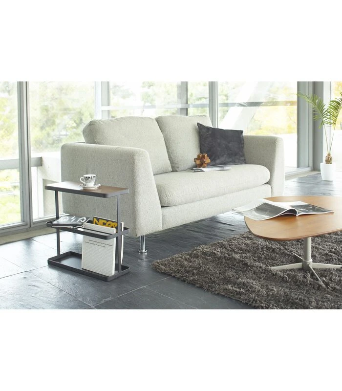 Op deze handige bijzettafel kun je niet alleen je spulletjes op de bovenkant of op het rooster leggen, maar ook rechtopstaand positioneren. De elegante combinatie van zwart staal en hout voegt een stijlvol accent aan je woonkamer toe. Gemaakt van staal en hout en ontworpen in Japan.