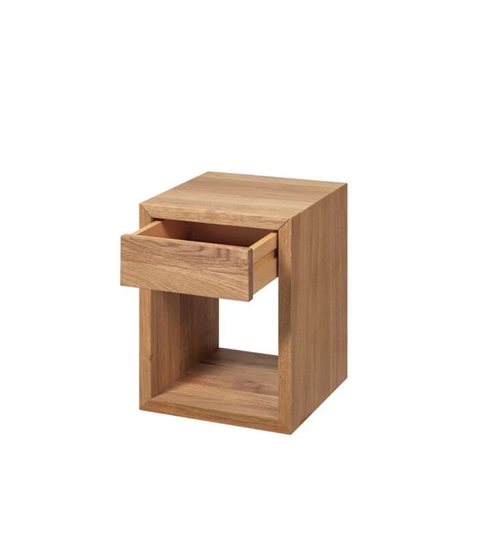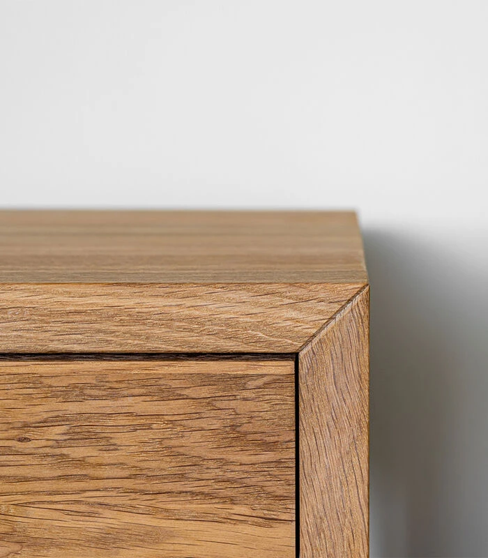 Het nachtkastje is gemaakt van massief eikenhout met een natuurlijke olieafwerking. Met een strakke, minimale stijl toont het de schoonheid van de natuurlijke nerf van het hout. Het heeft een handige lade en een plank voor het opbergen van uw favoriete boeken. Compact en functioneel het kan ook aan de muur worden gemonteerd en gebruikt als zwevende plank / lade niet alleen in de slaapkamer, maar ook rond het huis. Dit product is gemaakt van natuurlijk massief eikenhout, elk stuk is uniek qua kleur, natuurlijke kenmerken, nerfpatronen en afwerking. Het is dus mogelijk dat u enkele verschillen tussen artikelen van eenzelfde productlijn ziet; dit is onderdeel van de natuurlijke schoonheid van onze producten. Voor het binnenmateriaal van het product kunnen andere soorten hardhout worden gebruikt.